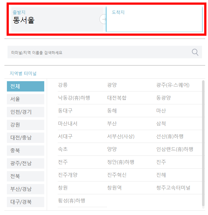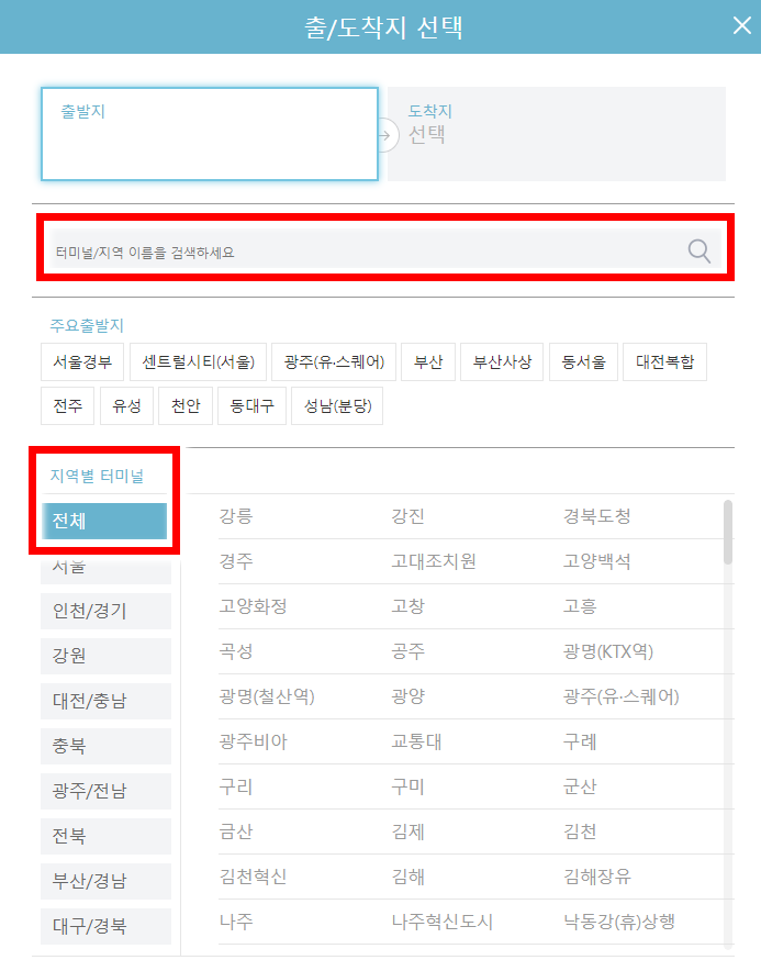 터미널 이름을 직접 입력하셔도 되고 아래의 지역별 터미널에서 해당하는 지역을 선택하셔도 됩니다. 출발하고자 하는 터미널을 지정 하게 되면 도착이 가능한 곳들의 명단이 나오니 쉽게 이용이 가능합니다.