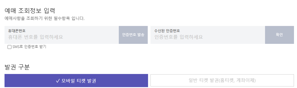 선택을 모두 완료하시면 회원이 아니어도 비회원 예매가 가능합니다. 몇가지의 동의를 하고 난후 후대폰 번호를 입력하고 인증번호를 받아서 발권을 할 수 있습니다.