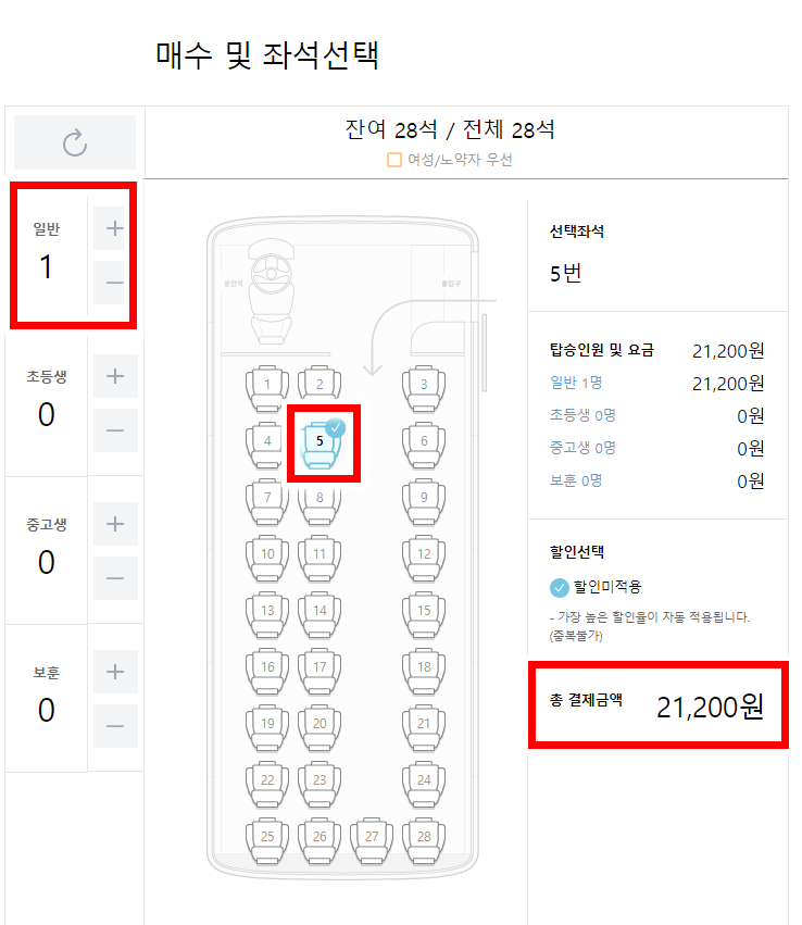 이렇게 배차조회를 하고 원하는 시간대의 버스노선을 선택하면 예매하실 매수와 좌석을 선택할수가 있습니다
